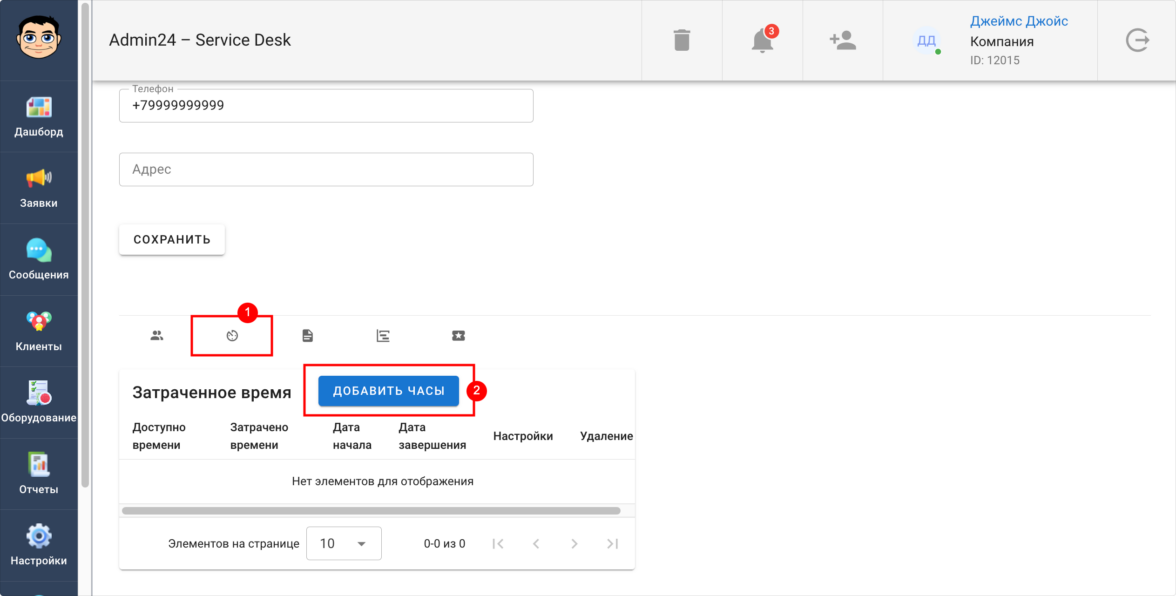 Далее перейдите во вкладку «Затраченное время», нажмите кнопку «Добавить часы».
