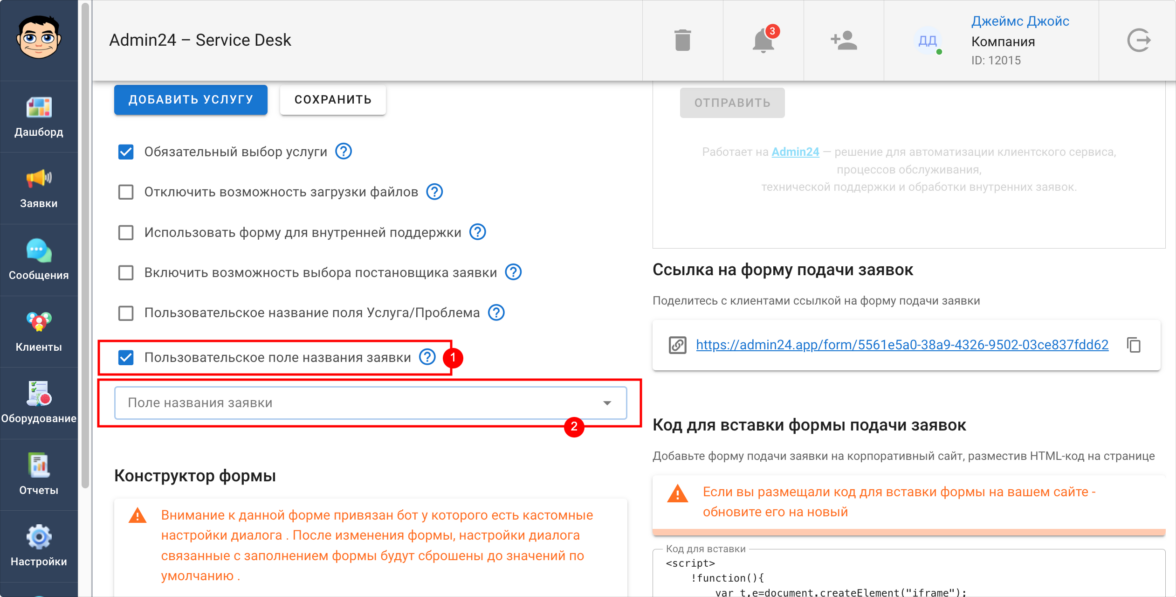 Добавлена возможность настроить, из какого поля формы будет сформировано название заявки