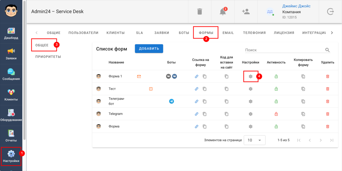 Чтобы настроить функционал, откройте раздел «Настройки» → «Формы» → «Общее» и кликните на значок шестеренки напротив нужной формы.