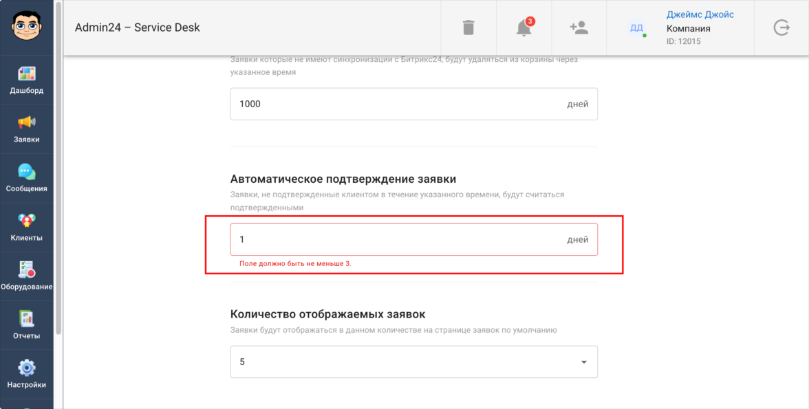 Ранее при выставлении значения в функции «Автоматическое подтверждение заявки», которая находится в разделе «Настройки» → «Заявки» → «Настройки», требовалось указать время от 15 дней.