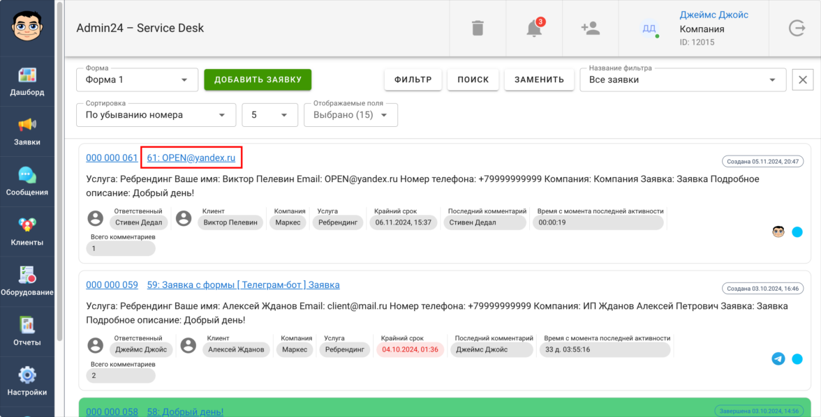 Так, например, если мы выберем тип поля «email», то названия новых обращений в разделе «Заявки» будут содержать электронный адрес отправителей:
