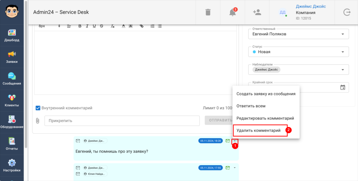 В новой версии Admin24 пользователи могут удалять внутренние комментарии, которые они оставили в заявках.