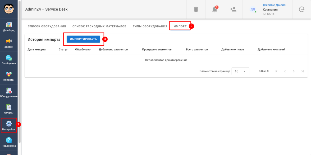 Чтобы это сделать, перейдите в раздел «Оборудование», далее — во вкладку «Импорт» и нажмите кнопку «Импортировать».