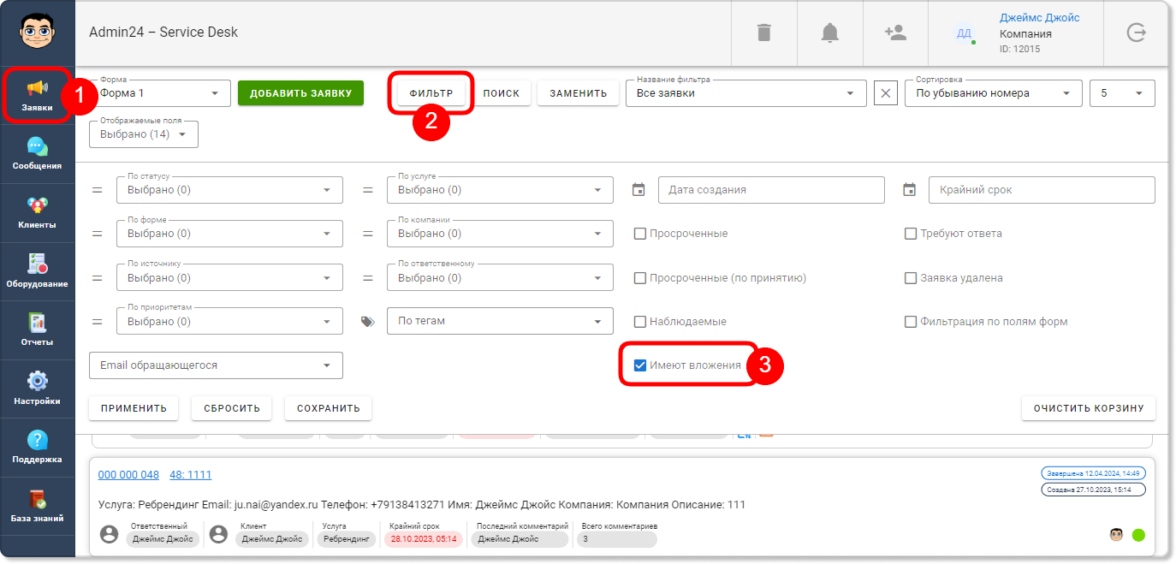 Кроме того, появилась возможность быстро находить все заявки с вложениями. Для этого в разделе «Заявки» нажмите на «Фильтр» и поставьте галочку рядом с пунктом «Имеют вложения».