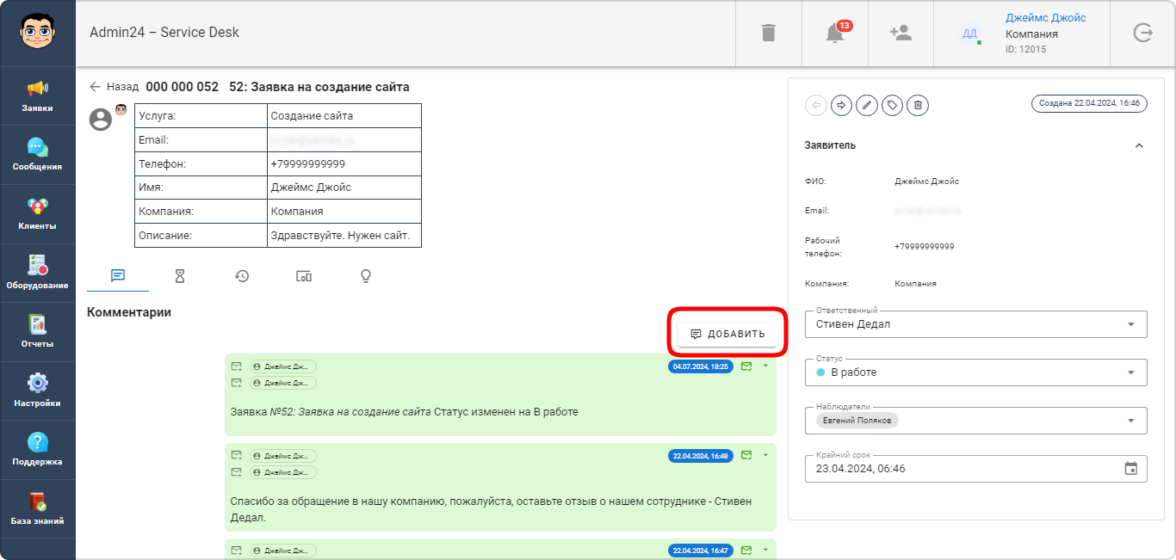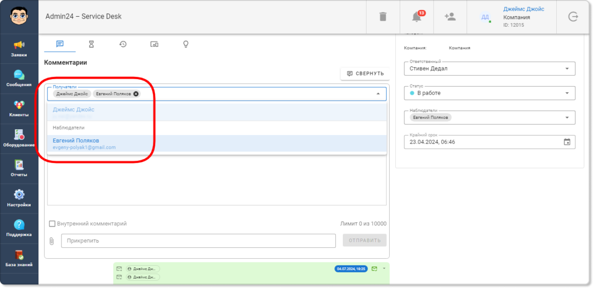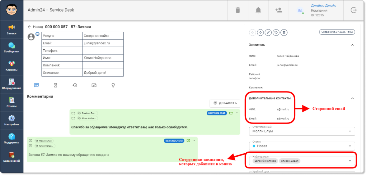 Если при подаче заявки через почту клиент добавит в копию адреса других сотрудников вашей компании, имеющих доступ к Admin24, то они автоматически добавятся в заявку в качестве наблюдателей.