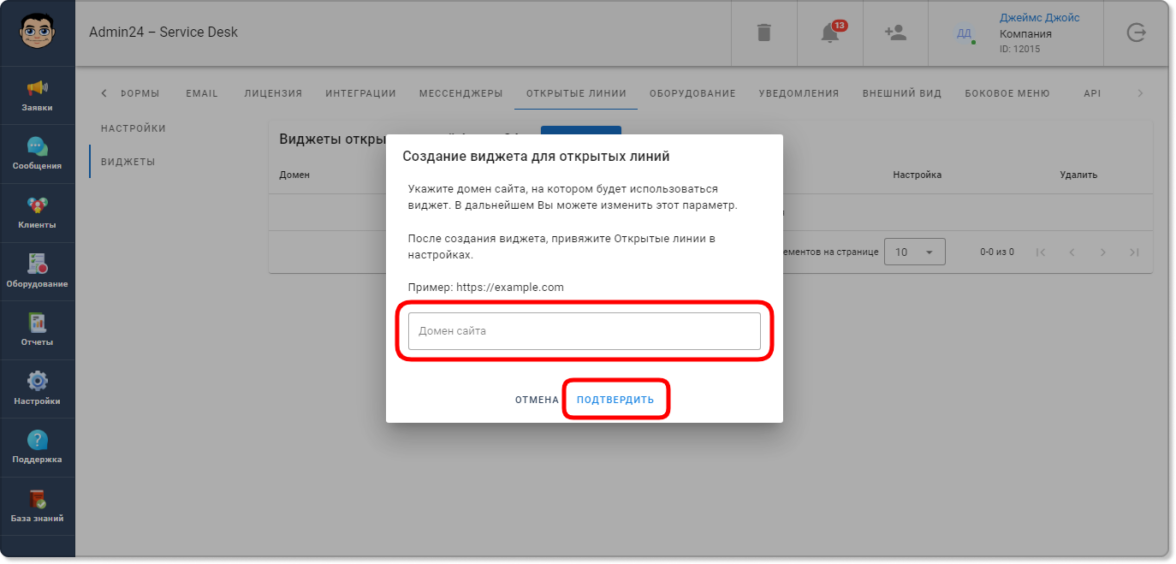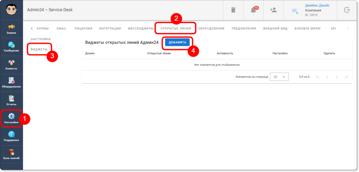 Чтобы добавить виджет, перейдите в «Настройки» → «Открытые линии» → «Виджеты». И нажмите кнопку «Добавить виджет».