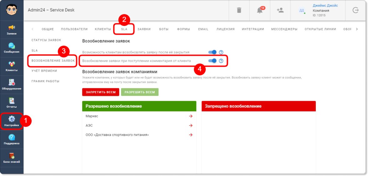 Эта функция включена по умолчанию. Чтобы ее деактивировать, перейдите в «Настройки» → SLA → «Возобновление заявок». И далее нажмите на ползунок рядом с полем «Возобновление заявки при поступлении комментария от клиента».