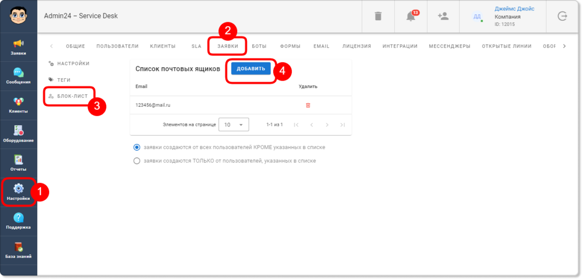 Чтобы добавить почтовый домен в блок-лист, перейдите в раздел «Настройки», далее — в «Заявки» → «Блок-лист» и нажмите кнопку «Добавить».