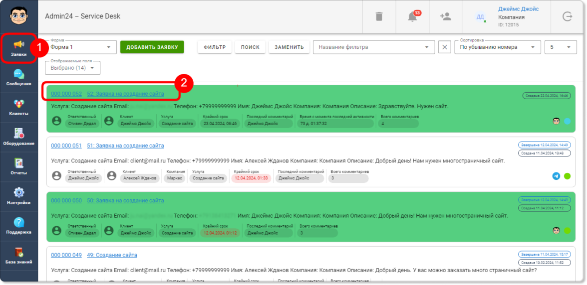 Для этого необходимо перейти в раздел «Заявки» и открыть нужное обращение.