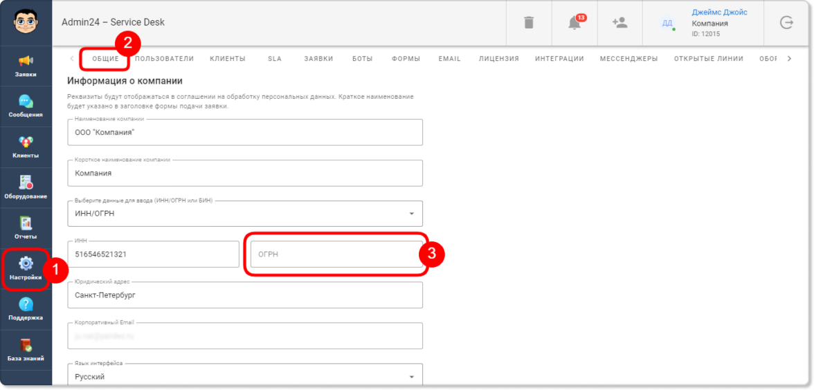 При заполнении информации о компании в разделе «Настройки» → «Общие» теперь необязательно добавлять ОГРН. При необходимости это поле можно оставить пустым.