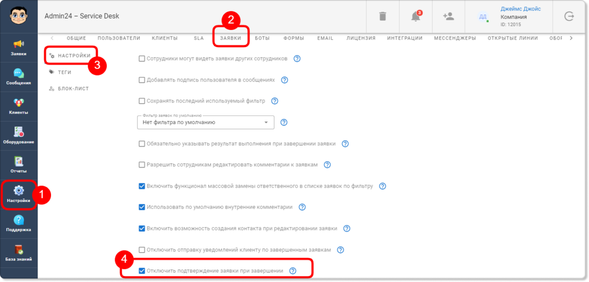 Чтобы отключить подтверждение закрытия заявки, перейдите в раздел Настройки. Далее — во вкладку «Заявки» → «Настройки» и поставьте галочку рядом с пунктом «Отключить подтверждение заявки при завершении».