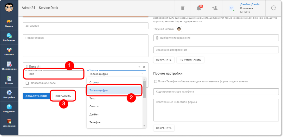 Добавлен тип поля «Только цифры» в настройках кастомной формы