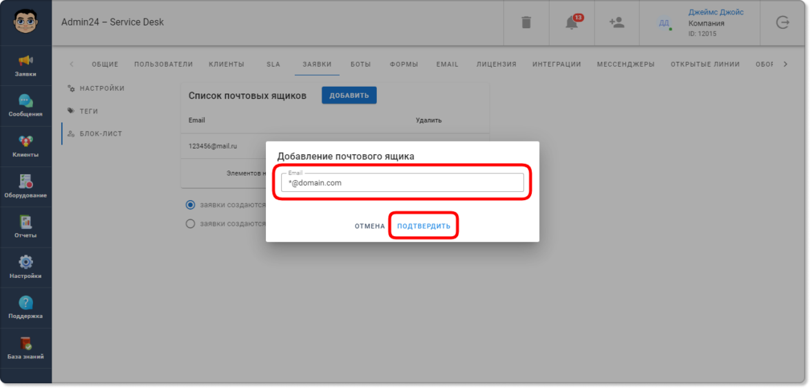 Ранее в блок-лист можно было добавить только конкретный email-адрес сотрудника компании, чтобы запретить или разрешить ему отправлять заявки. Теперь же вы можете внести в блок-лист сразу почтовый домен. В этом случае выбранное действие будет применяться для всех адресов на этом домене.