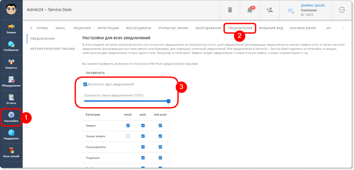 Теперь в Admin24 можно настроить уровень громкости уведомлений или полностью отключить у них звук.