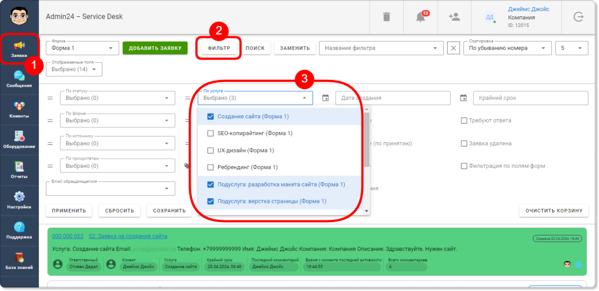 Для более удобного поиска обращений мы добавили возможность настраивать фильтр заявок не только по основным услугам, но также по подуслугам.