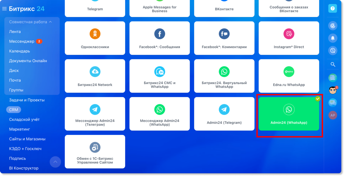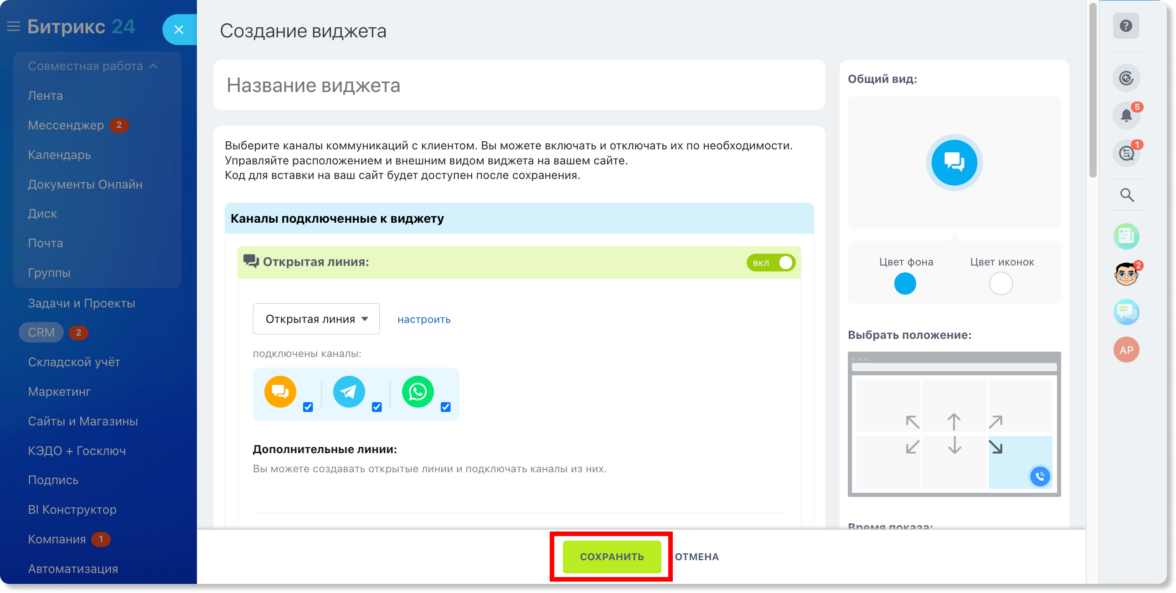 Добавлена возможность создавать виджеты открытых линий Битрикс24 для коннекторов Telegram.A24 и WhatsApp.A24*