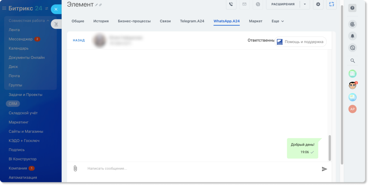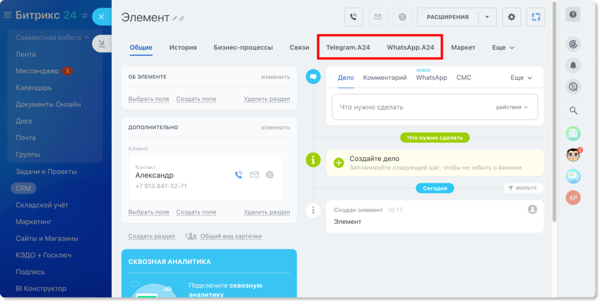 Добавлены вкладки WhatsApp.A24* и Telegram.A24 в карточку элемента смарт-процесса Битрикс24