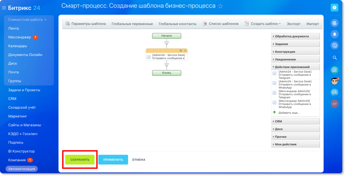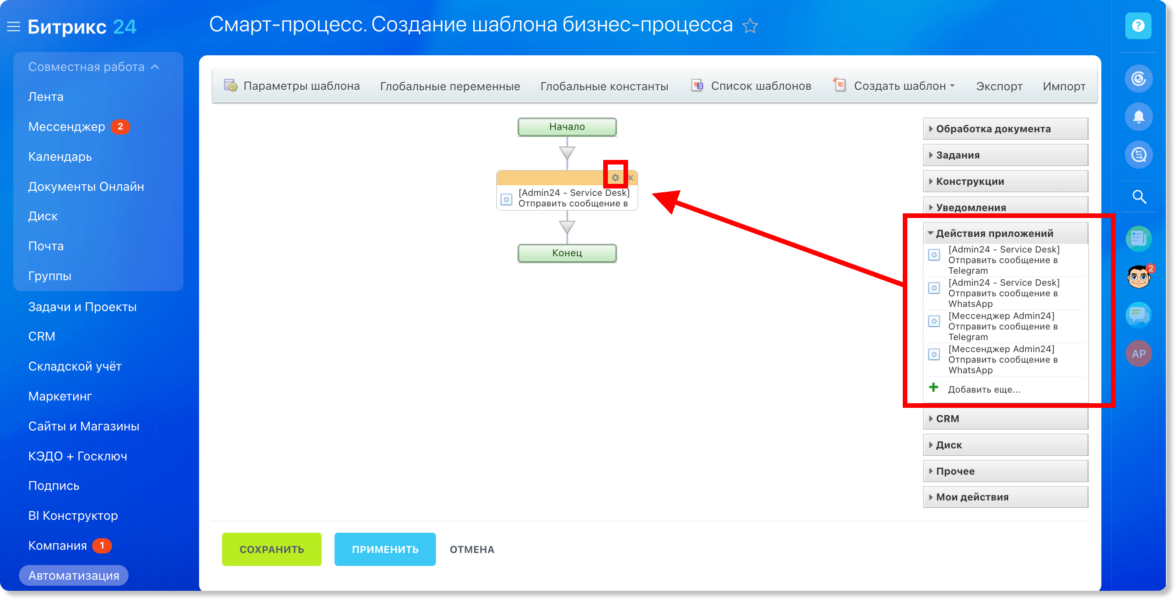 Далее в дизайнер бизнес-процессов из блока «Действия приложений» перенесите элемент с названием мессенджера, для которого хотите задать действие.