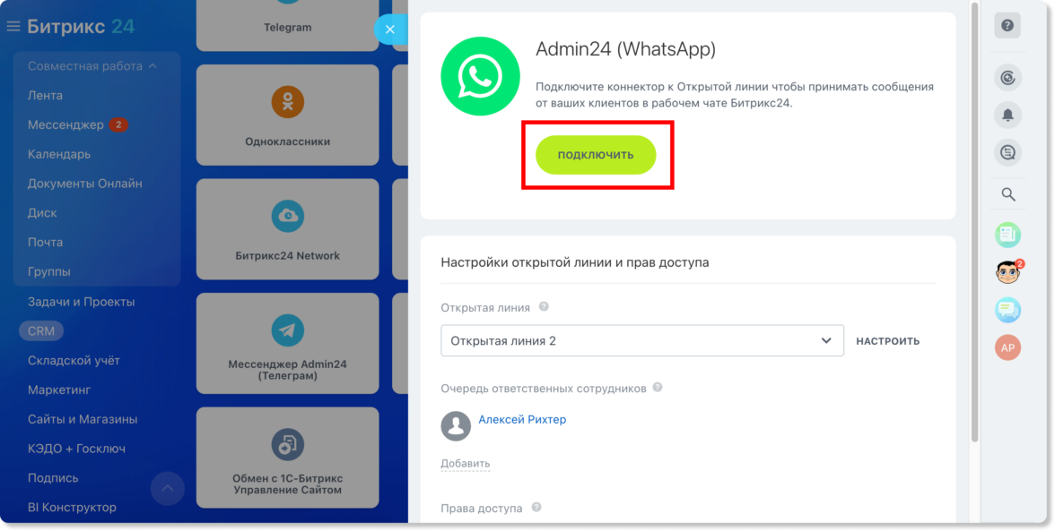 Далее в «Контакт-центре» подключите мессенджеры. Для этого нажмите на карточку с нужным сервисом, например, WhatsApp*, кликните на кнопку «Подключить» и подтвердите подключение мессенджера к открытым линиям.