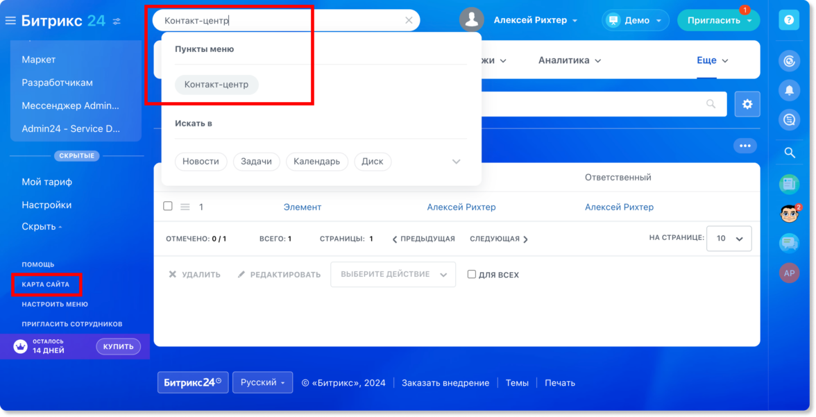 Чтобы это сделать, в аккаунте Битрикс24 откройте «Контакт-центр», введя название раздела в поиске или перейдя в него через «Карту сайта».