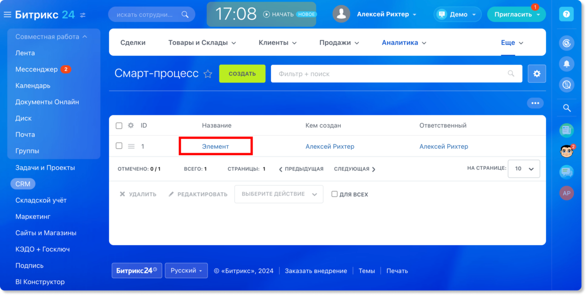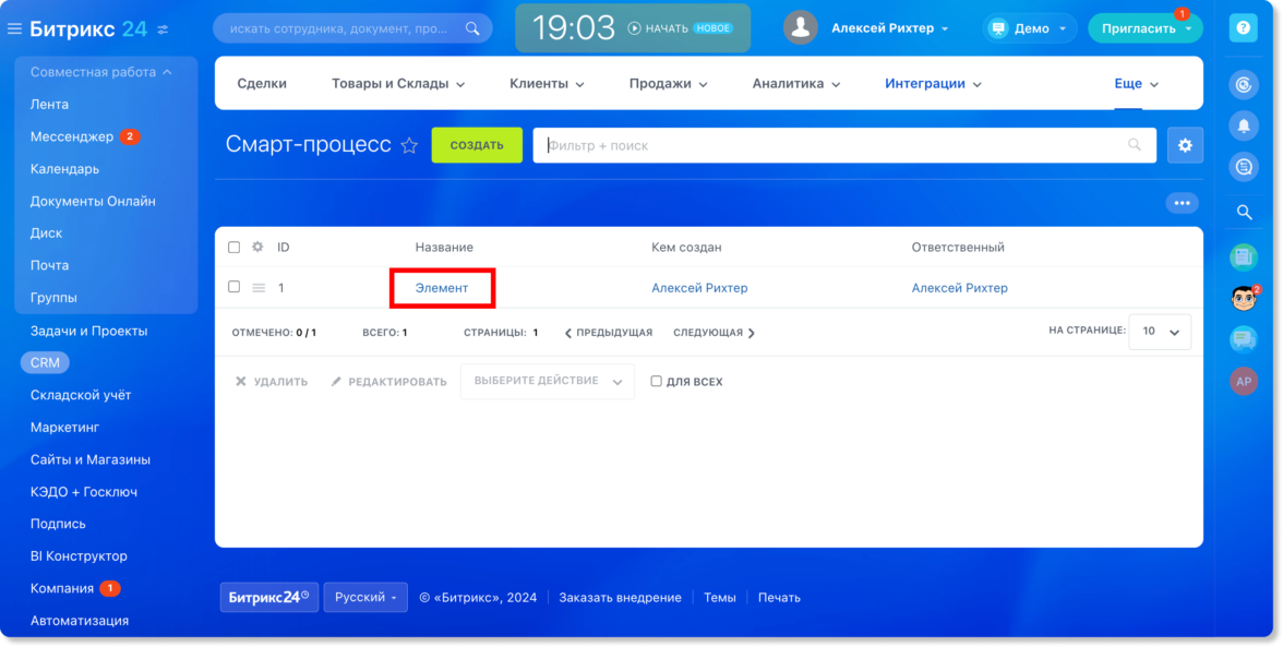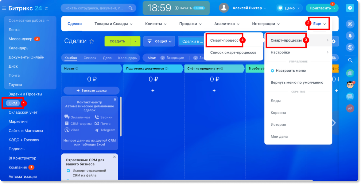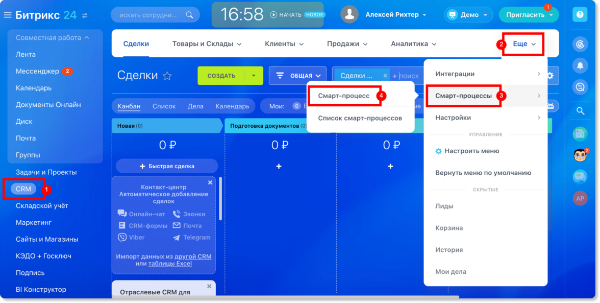 После этого для проверки настроек и запуска смарт-процесса перейдите в раздел CRM. Далее — во вкладку «Еще» → «Смарт-процессы» → «Смарт-процесс».