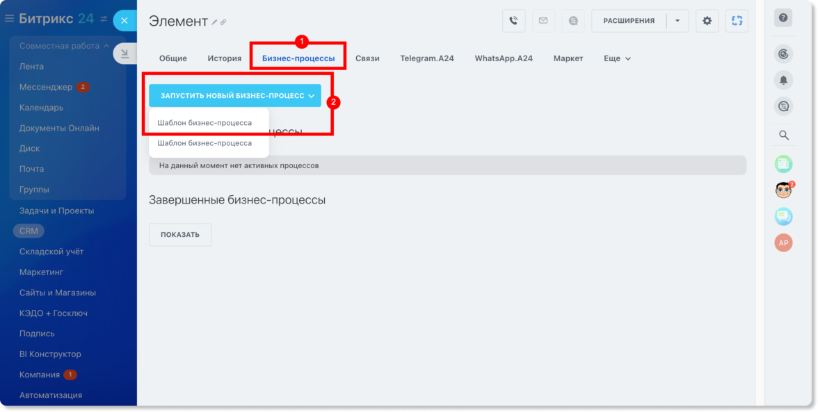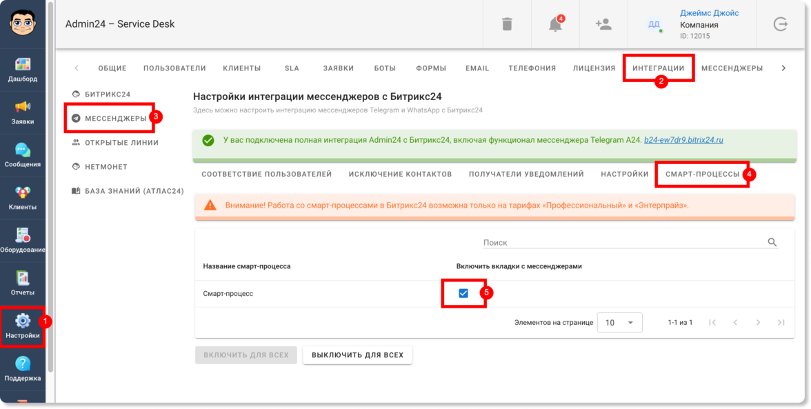 Отметим, что по умолчанию эти вкладки у смарт-процессов отключены. Чтобы их включить, в настройках Admin24 откройте вкладку «Интеграции», перейдите в «Мессенджеры» → «Смарт-процессы» и поставьте галочку напротив нужного процесса.