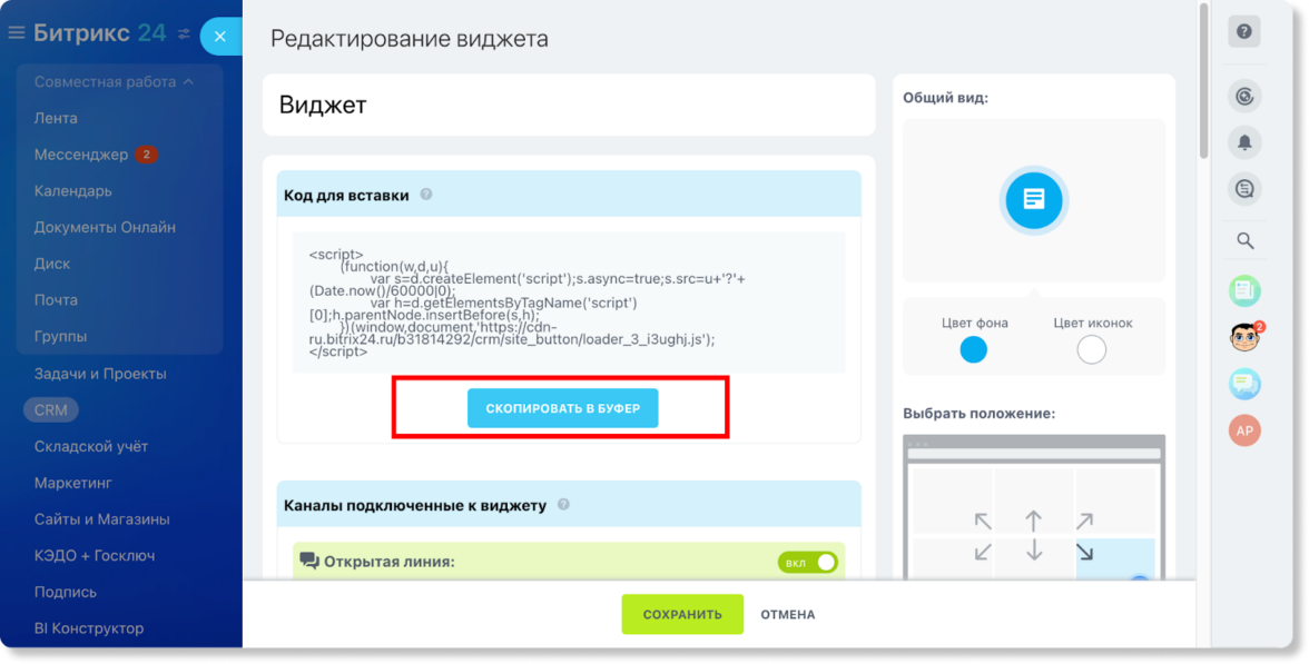 Затем снова зайдите в созданный виджет, скопируйте код и вставьте его на свой сайт.