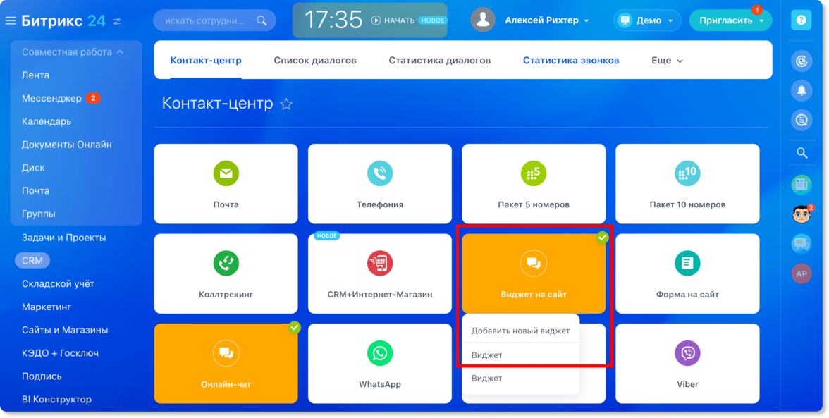 Далее нажмите на карточку «Виджет на сайт», при необходимости предварительно обновив страницу.