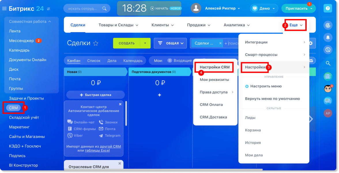 Для настройки функционала в Битрикс24 откройте вкладку «CRM», перейдите в «Еще» → «Настройки» → «Настройки CRM».