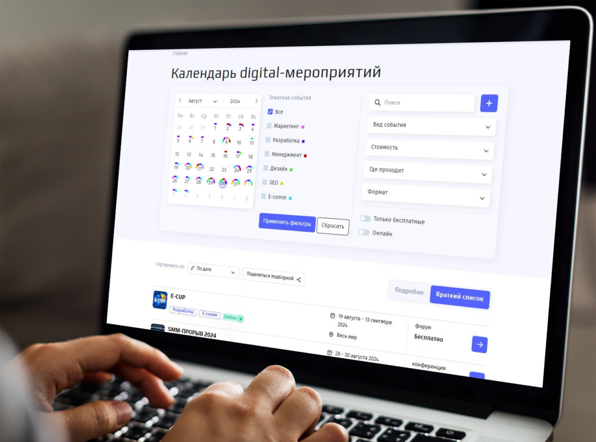 Представляем вам диджитал-календарь — сервис, в котором собраны все крупные и важные конференции в сферах диджитал-маркетинга, программирования, менеджмента, дизайна, SEO и e-commerce. Это самый масштабный календарь диджитал-мероприятий в России, созданный для того, чтобы вы всегда были в курсе ключевых событий.