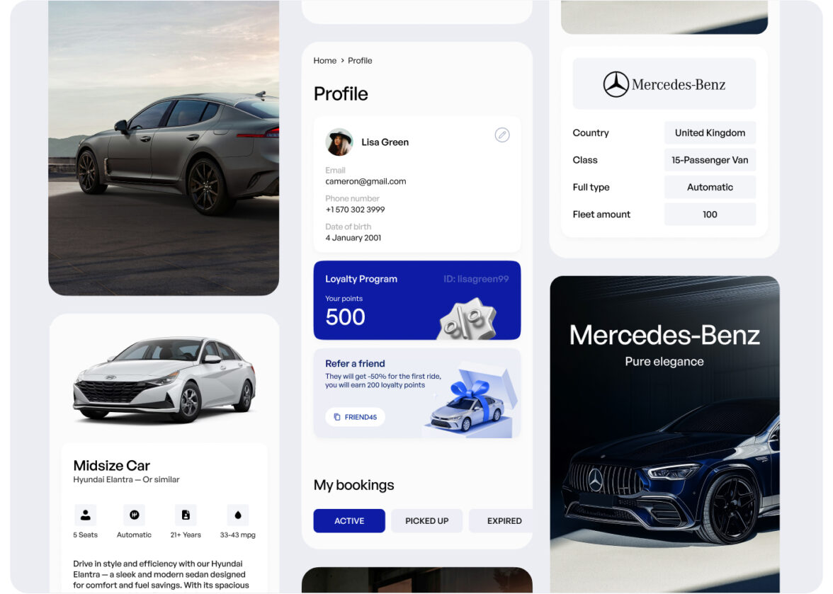 Изучив поведение пользователей на платформе, мы оптимизировали сценарий бронирования, сократив его до трех простых шагов: выбор параметров аренды, ввод персональных данных и подбор дополнительных услуг. Это позволило создать ясный и функциональный виджет выбора автомобилей, где посетители могли удобно выбирать город, дату проката и подходящую модель транспортного средства. Данные клиента организованы компактно и эффективно группируются по ключевым аспектам, а оформление страховок и дополнительных сервисов производится посредством удобных переключателей.