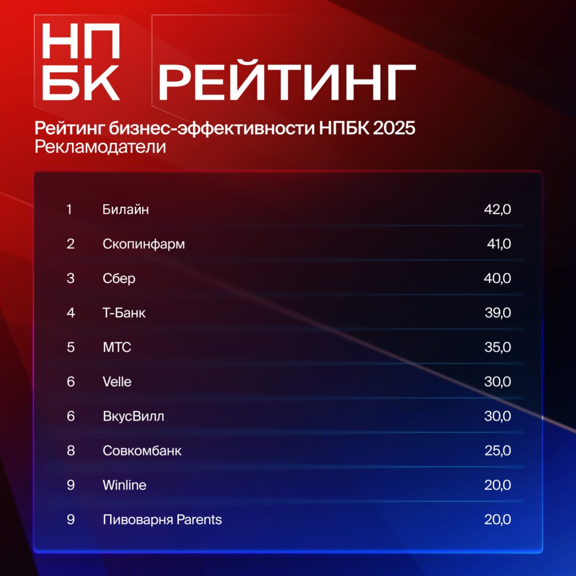 В категории рекламодателей первое место заняла компания Билайн, набравшая 42 балла. На втором месте — Скопинфарм с 41 баллом, и на третьем — Сбер, получивший 40 баллов.