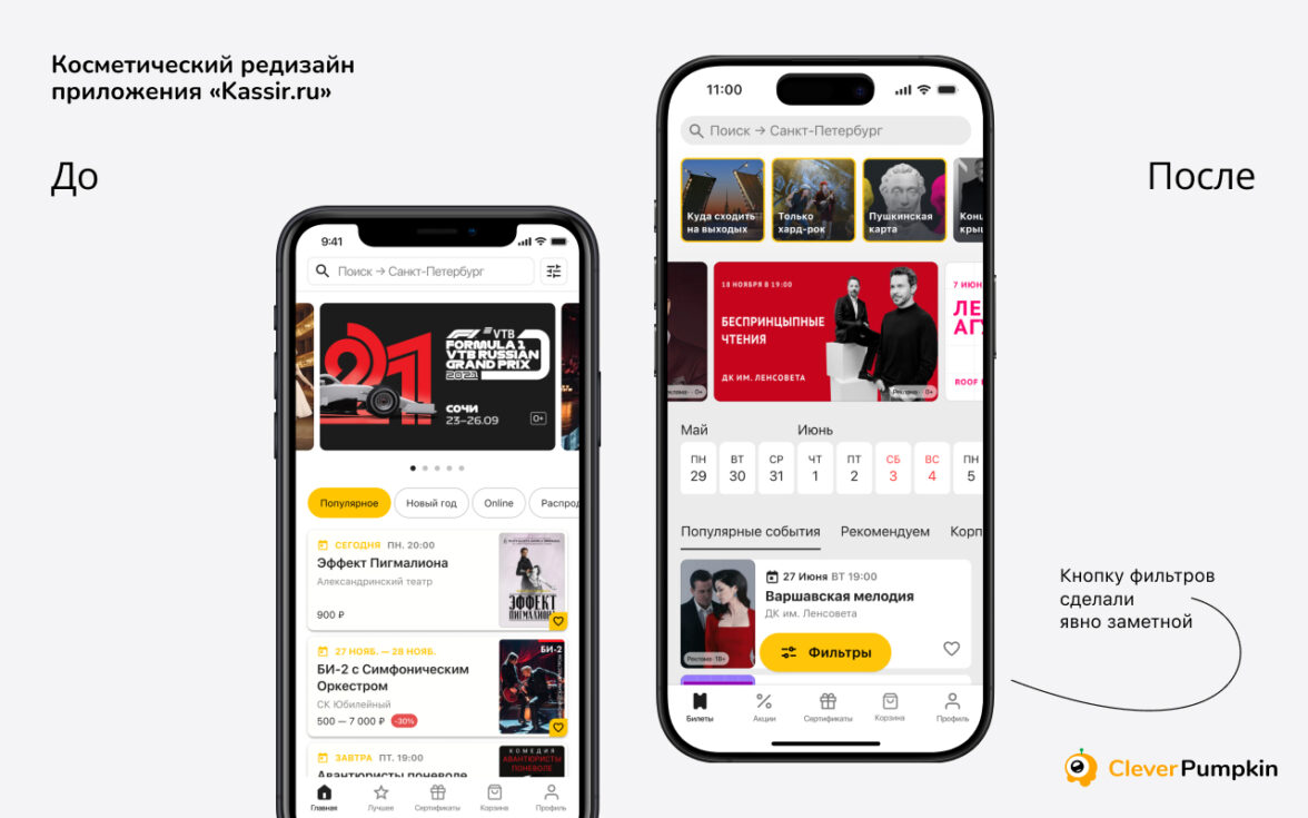 Пример редизайна Kassir.ru. Важные элементы сделали крупнее, дополнительные данные пользователя скрыли