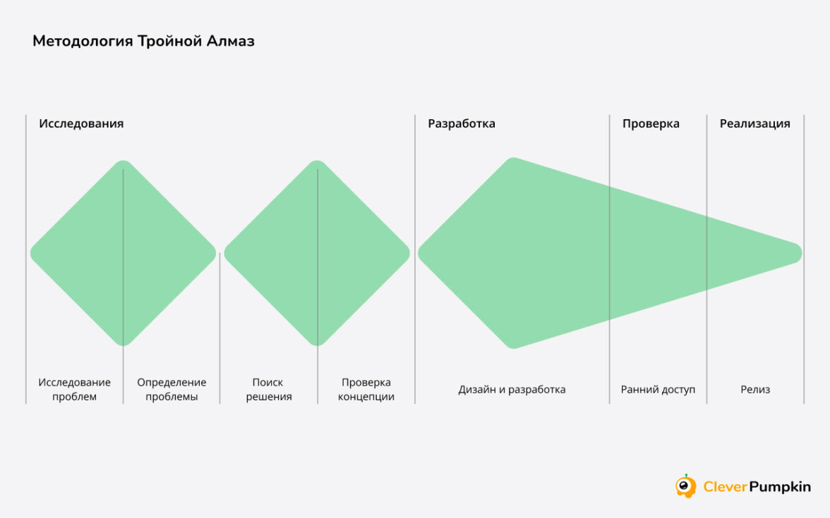 Чтобы избежать описанных выше рисков, я рекомендую использовать метод тройного алмаза (Triple Diamond). Он как раз помогает лучше понять пользователей, сформировать обоснованные гипотезы и протестировать решения до масштабного внедрения. Такой подход снижает вероятность ошибок, экономит время и бюджет и повышает шансы создать действительно полезный продукт.