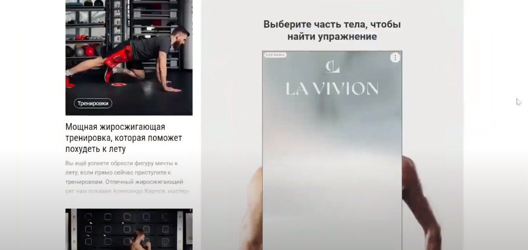 Ниже расположен большой тематический блок навигации, позволяющий по клику перейти в раздел с упражнениями для определенных групп мышц. Прямо на нем размещен встроенный рекламный формат.
