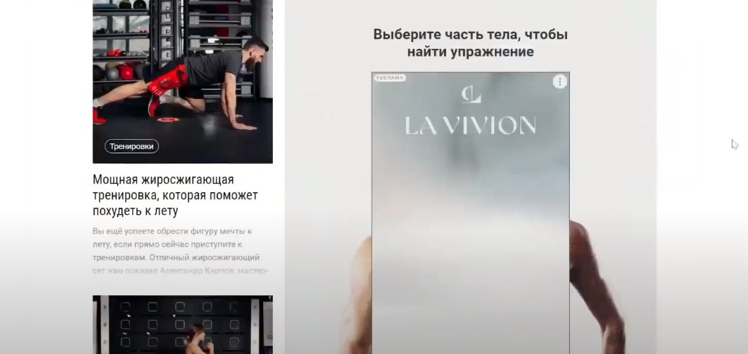 Ниже расположен большой тематический блок навигации, позволяющий по клику перейти в раздел с упражнениями для определенных групп мышц. Прямо на нем размещен встроенный рекламный формат.