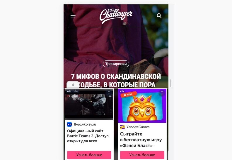 Других рекламных форматов на странице нет. Тем не менее, если одно проверенное решение хорошо себя показывает, то вполне можно ограничиться тем, чтобы масштабировать его на всю страницу. Особенно — если дизайн это позволяет.