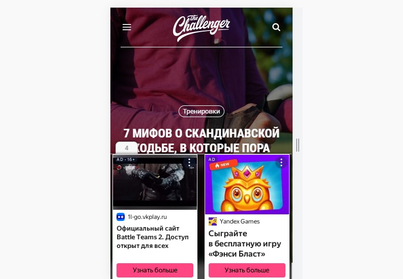 Из-за разрешения экрана рекламные форматы в таком варианте встречаются реже, а потому выглядят менее навязчиво. С точки зрения пользователя это формирует положительный опыт.Очевидно, что сайт сильнее рассчитан на мобильный трафик.