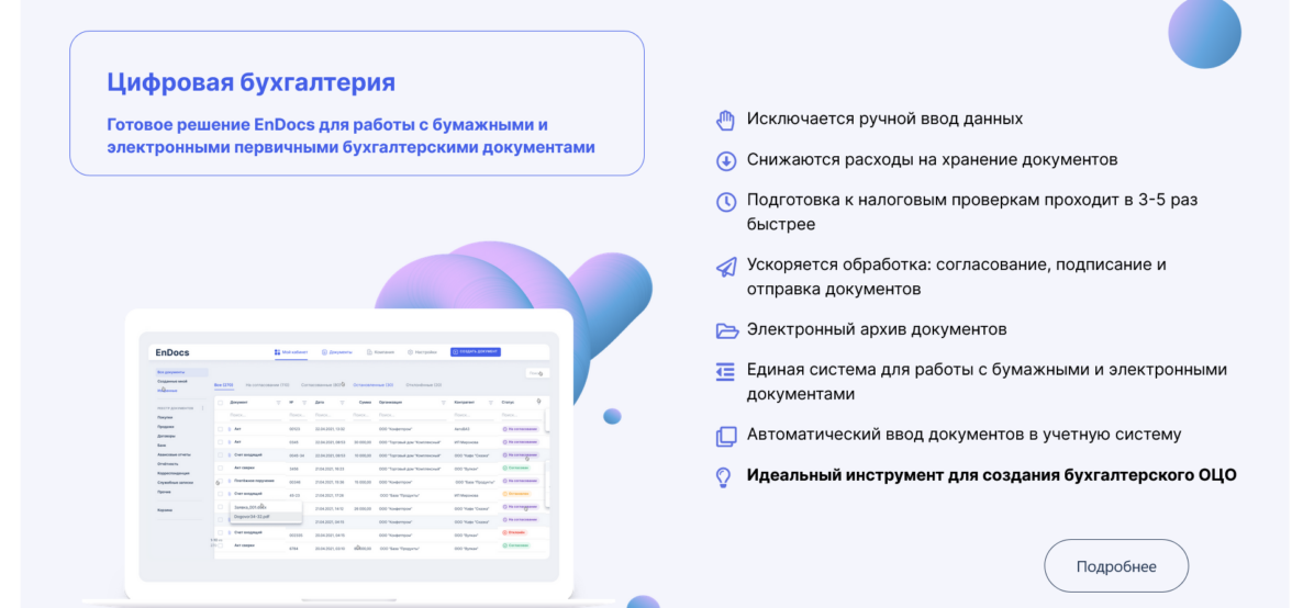 Сервис документооборота EnDocs перечисляет все преимущества списком, а дальше раскрывает их более подробно