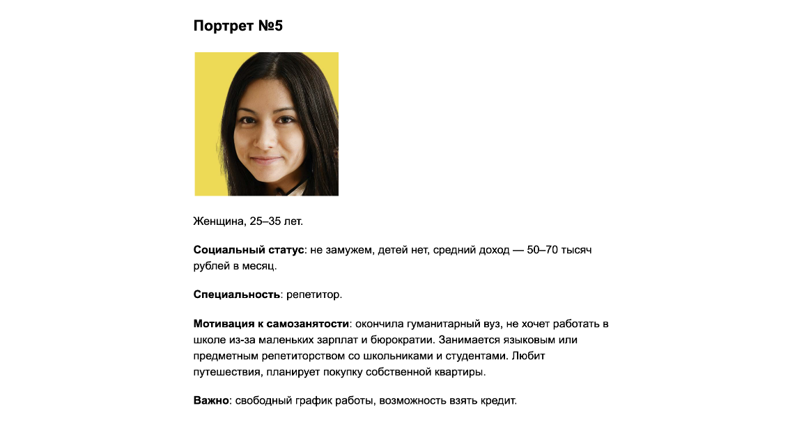 Пример портрета целевой аудитории сервиса для самозанятых. При проектировании сайта можно представлять эту девушку и продумывать, какую информацию она хотела бы видеть