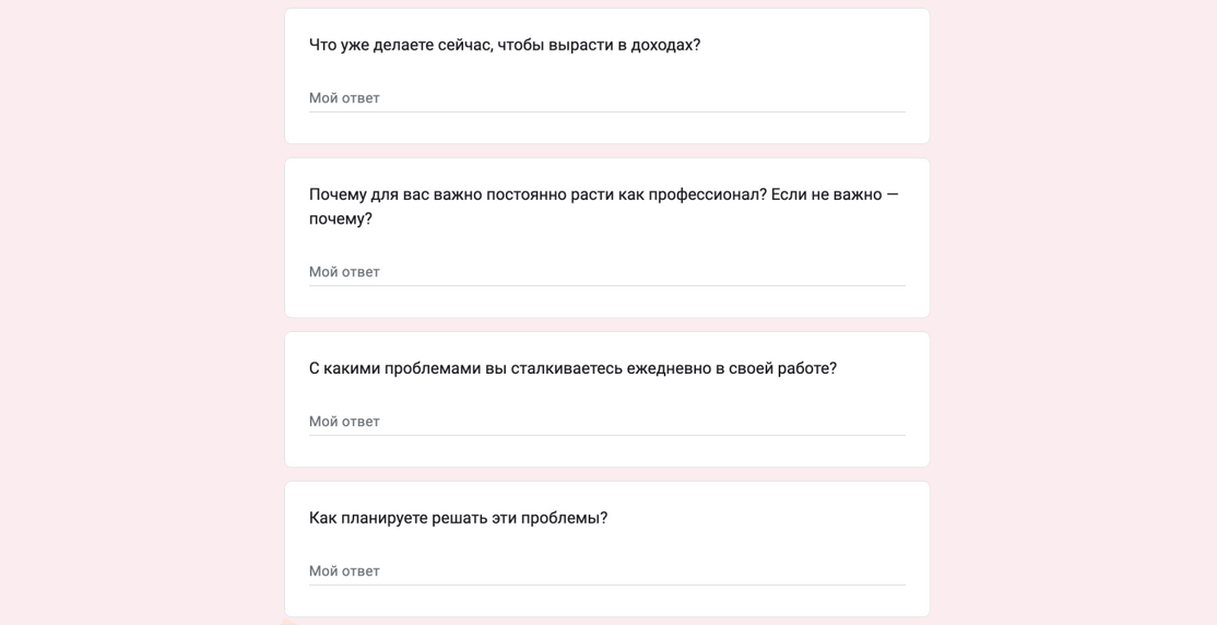 Для составления анкет мы чаще всего используем Google-формы. Инструмент бесплатный, пользователю не нужно регистрироваться, а данные можно загрузить в CRM