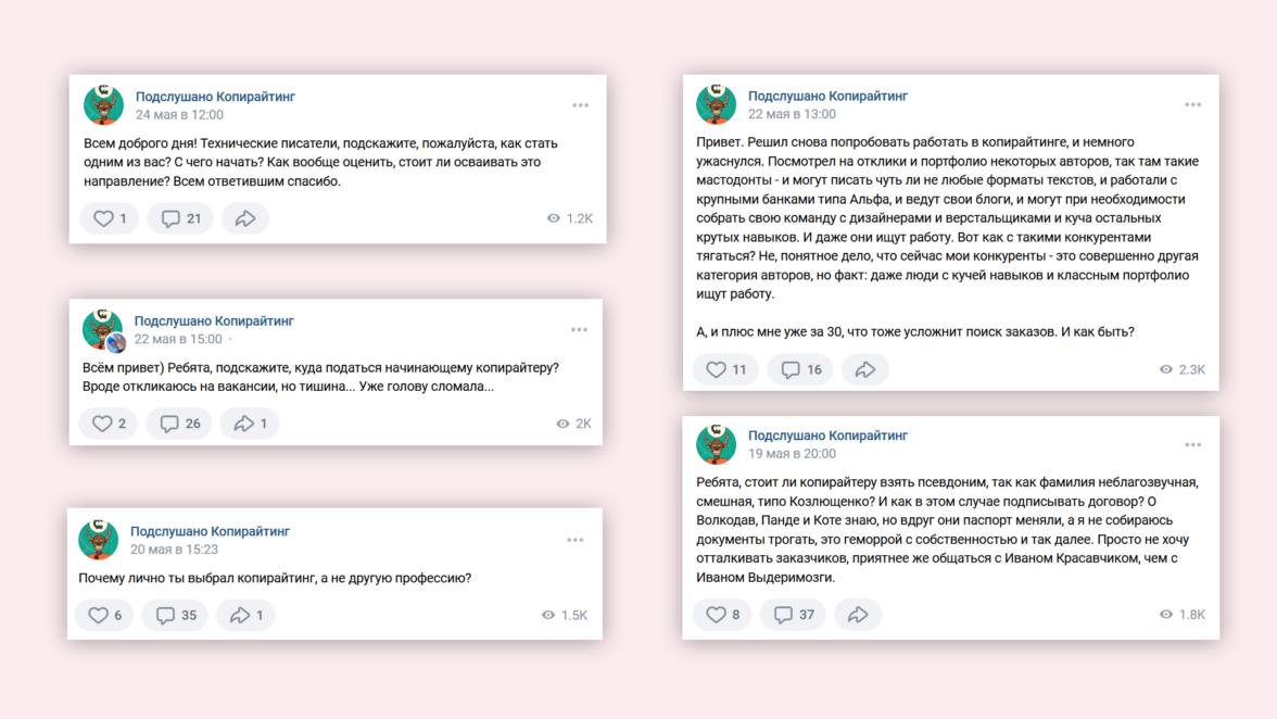 У меня есть паблик «Подслушано Копирайтинг» на 30 тысяч подписчиков. Когда запускаем новый продукт для авторов — вдохновляемся обсуждениями в нём