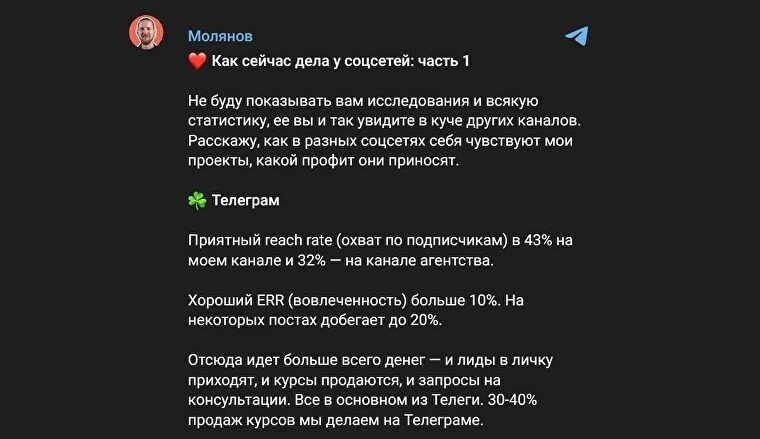 Пример из моего блога: в посте делюсь статистикой своих соцсетей и рассказываю, для чего лучше использовать каждую из них
