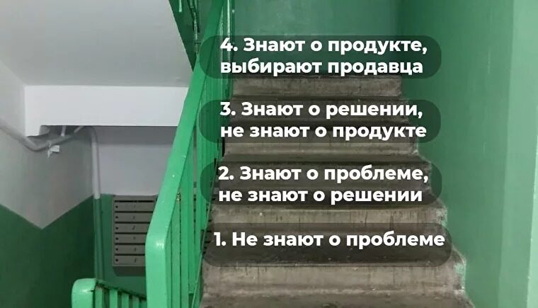 Продумывайте сценарии для контента. Для этого мы используем Лестницу Ханта — это принцип, по которому целевую аудиторию делят в соответствии со степенью подготовки. Для пользователей, которые не осознают проблему, стоит создать спрос. Тем, у кого уже созрел спрос, можно рассказать о разных решениях проблемы. Дальше — о конкретном решении. На последней ступени — о конкретном продукте.