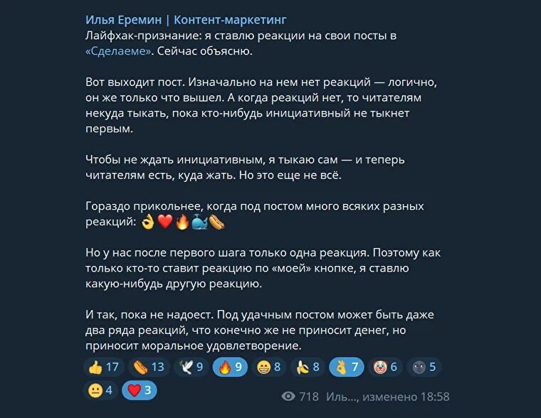Пример поста Ильи Ерёмина: кликбейт оказался таким сильным, что при 718 просмотрах пост собрал 89 реакций