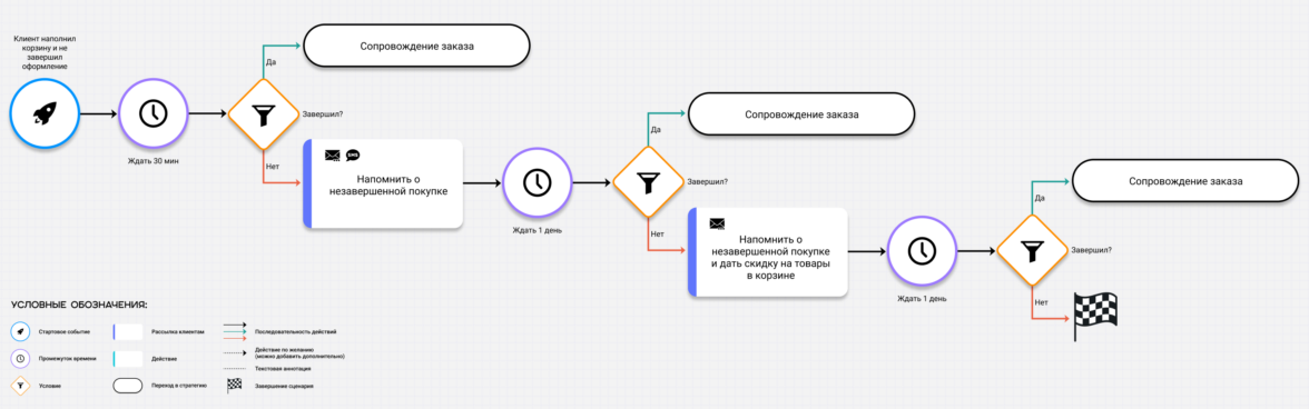 Например, можно отправить напоминания о брошенной корзине с обращение по имени и упоминанием товара, покупку которого клиент не завершил. Это служит лёгким толчком к окончанию покупки и, как следствие, к повышению удовлетворённости клиента.