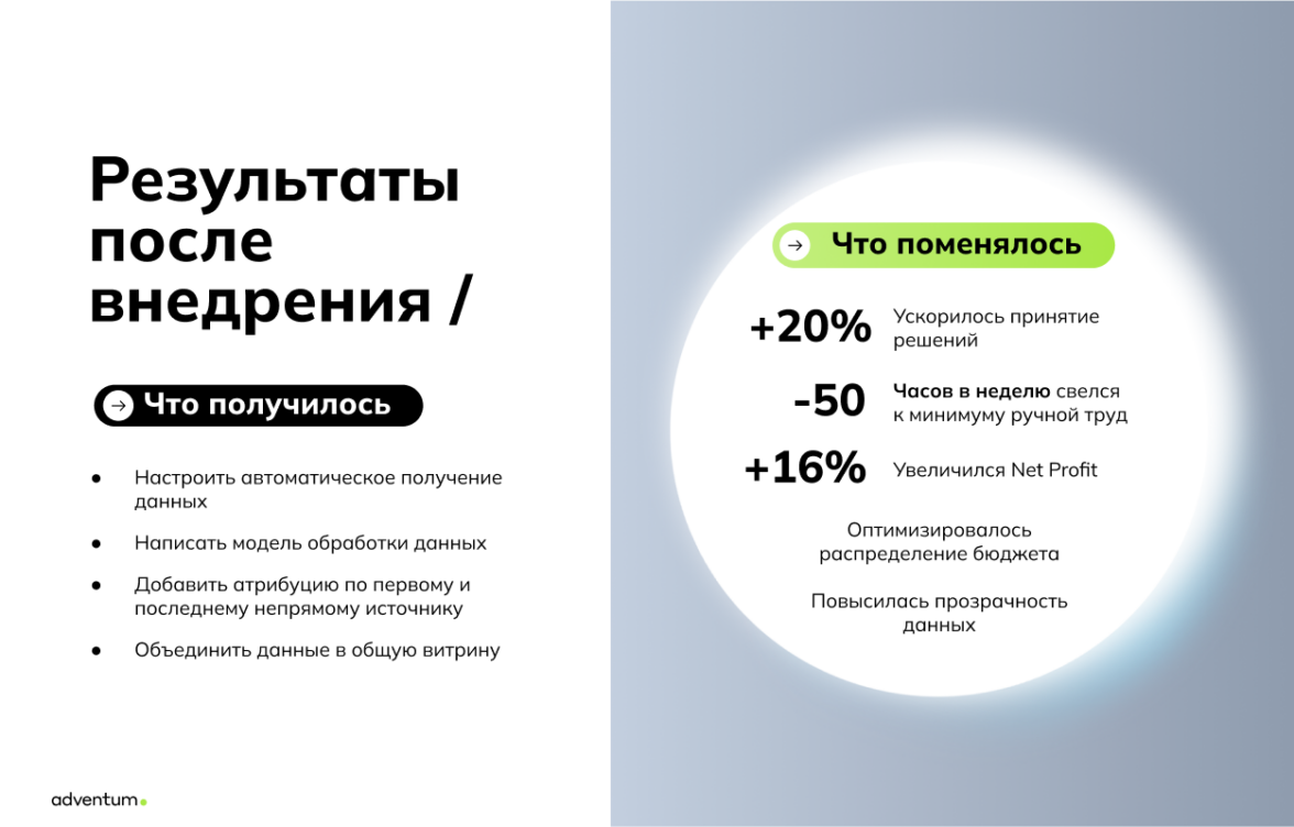Полная автоматизация сбора данных и построения отчётов. То, что раньше выполнялось вручную в Google Таблицах и отнимало часы перед каждой планёркой, теперь обновляется автоматически. Это позволило сэкономить до 50 часов в неделю на построение отчетов и визуализации за счет автоматизации процессов выгрузки данных.