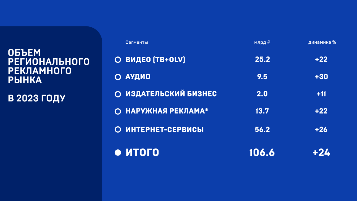 медиасегментам — видео, аудио, издательский бизнес, наружная реклама и интернет-сервисы — в 2023 году составил 106.6 млрд рублей, что больше