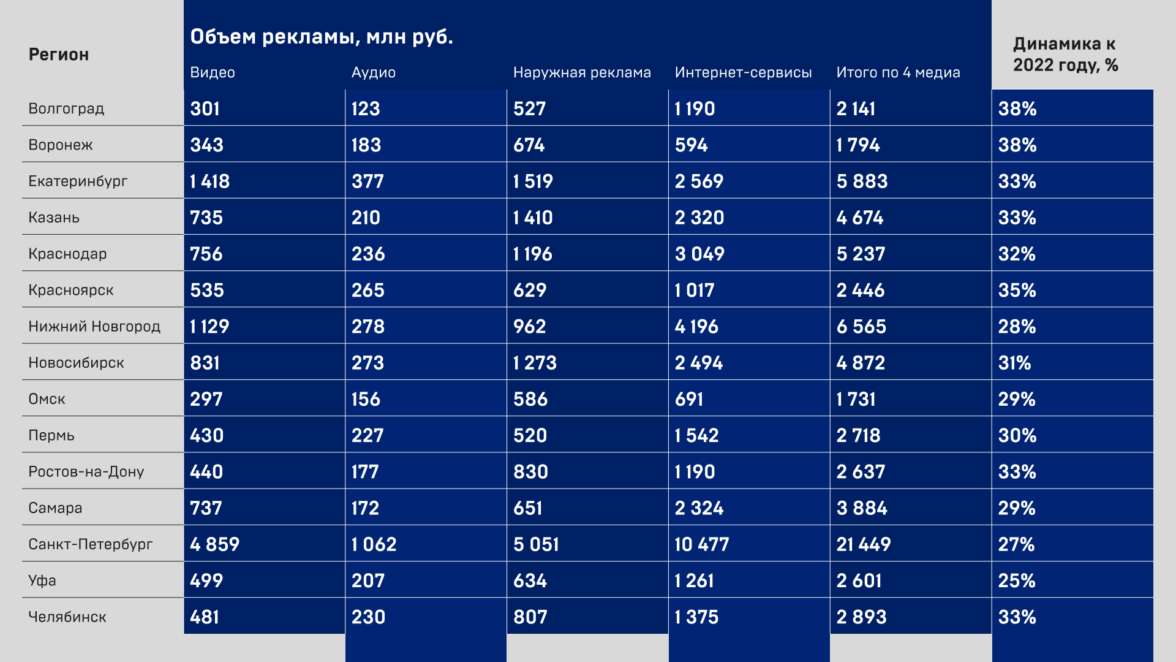 Рабочая группа по оценке объемов региональных рекламных рынков в составе Комиссии экспертов АКАР провела оценку объемов рынков 15-ти крупнейших городов-миллионников (за исключением Москвы) за 2023 год. В итоговую оценку вошли четыре основных медиасегмента (за исключением издательского бизнеса): видео, аудио, наружная реклама и интернет-сервисы.
