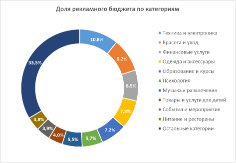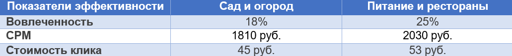 Следует отметить, что показатели эффективности отличаются в разных тематиках. Прежде всего на это влияют каналы, в которых рекламодатели той или иной тематики предпочитают размещать интеграции. Например, бизнес в категории «Сад и огород» предпочитает размещаться в тематических каналах, то есть тех, что посвящены даче и огороду, ландшафтному дизайну, озеленению и т.п., а рекламодатели в категории «Питание и рестораны» часто публикуют посты в региональных новостных пабликах. Соответственно, две категории имеют разные показатели эффективности.